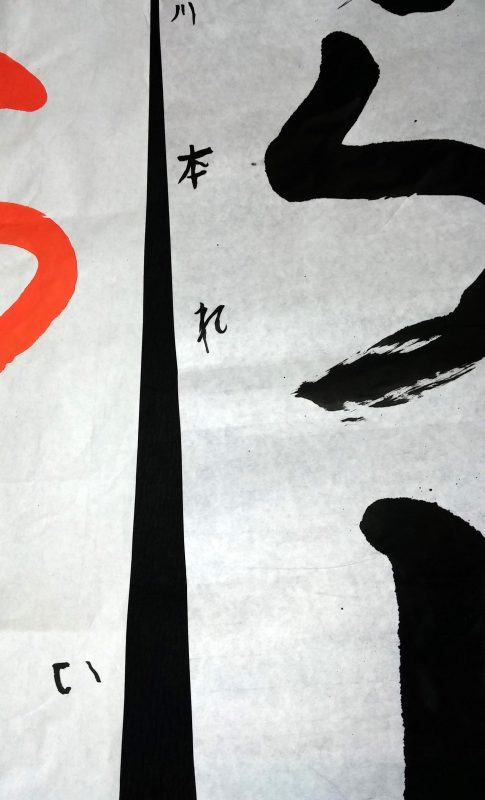 一年生のれいちゃんが夏休みの宿題で条幅作品に挑戦した。名前を最後まで書いたつもりが「れい」のいが見当たらない。よく確認すると手本に書いていた。皆笑顔になった。