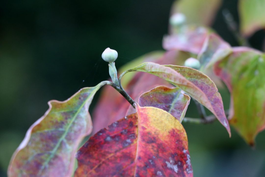 庭のハナミズキ。葉は紅葉し始めているが、それぞれにしっかりと力強い芽を蓄えて頼もしい限りだ。