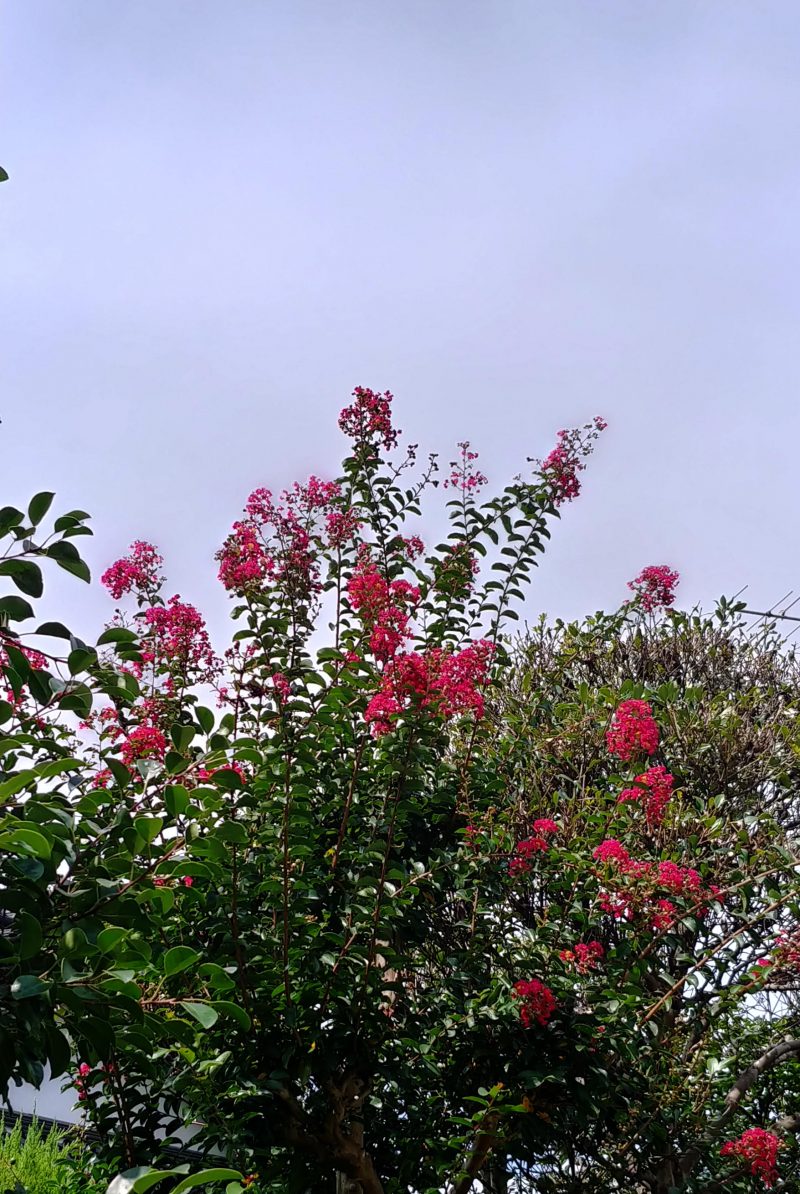 目の前の百日紅。炎天下にこの色は良く似合う。青空に伸びる姿は小さな草花とはまた違った力を与えてくれる。健康に気をつけて来夏も一緒に天空を目指したいものだ。