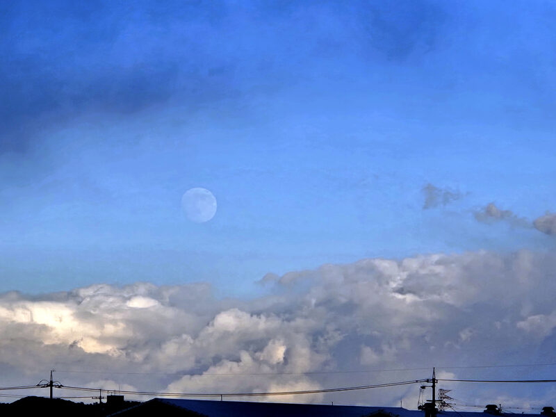 白昼白い月 畏敬の念 2025/12/6 Diary 散歩(徘徊に近いかも)の途中,薄らと巨大な白い月。思わず足を止め眺めた。畏敬の念さへ覚える光景である。何十年前だが西安の銀河賓館で夜中の3時外が明るい。窓を開けると煌々と照る一片の月であった。正に李白「長安一片月」であった。窓の下の中庭では兵隊がパトロールしていたのも忘れられない。