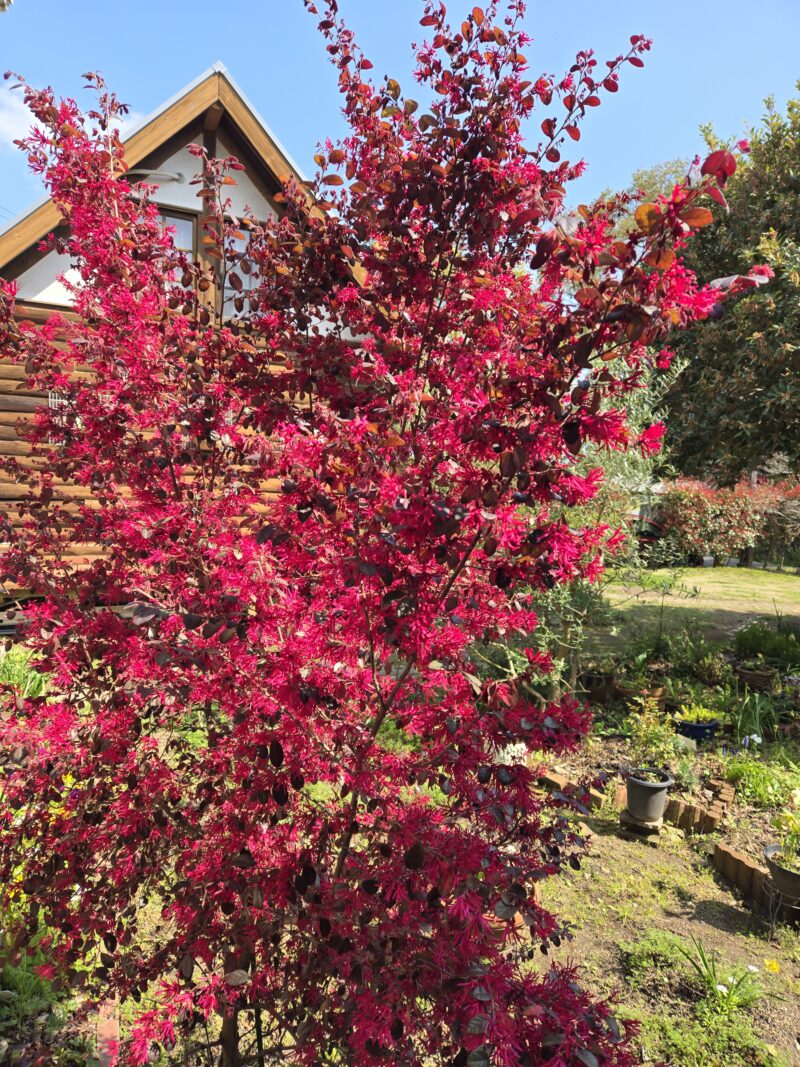 ヤマモモの緑、ミモザの黄、マンサクの赤や南側垣根のカナメモチも赤い新芽まを出している。まるで信号機だ。